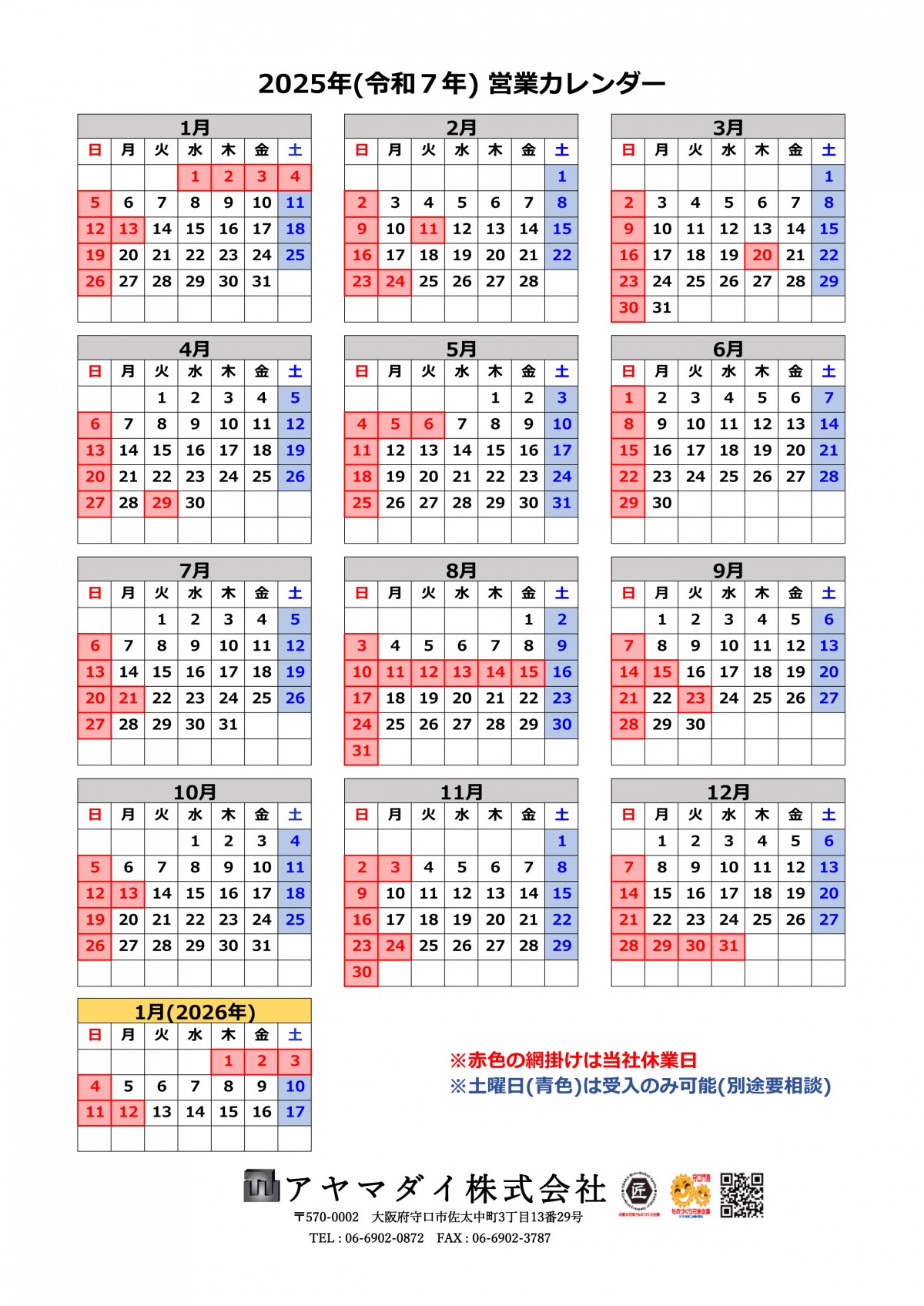 2025年度2026年度アヤマダイ営業日カレンダー